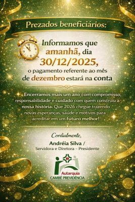 A prova de vida é obrigatória para todos aposentados e pensionistas da Autarquia Cambé Previdência no mês do seu aniversário . A falta da prova de Vida implica na suspensão dos proventos até a sua regularização. COMO FAZER A PROVA DE VIDA: Clique aqui: https://www.sistams.org.br/noticias/x1f534-atencao-aposentados-e-pensionistas-nao-esqueca-de-fazer-sua-prova-de-vida/
