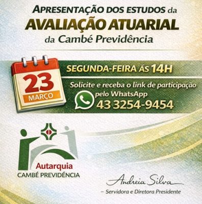 A Cambé Previdência realizará, no dia 23 de março, às 14h, a apresentação oficial dos resultados da Avaliação Atuarial 2026, com data-base 2025.